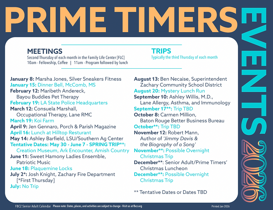 Prime Timers is our senior adult community group that gathers at FBCZ several times each month and is open to all local senior adults regardless of church association. There’s a general lunch meeting usually held each second Thursday of the month in the Family Life Center and one regularly scheduled trip per month (usually on the third Thursday of the month). Confirm our meeting schedule with the church calendar because we sometimes move meetings to accommodate holidays and /or special events. A typical monthly meeting includes fellowship and games that begin around 10am, a program of inspiration, information and/or entertainment around 11am followed by lunch (provided for a small fee).​